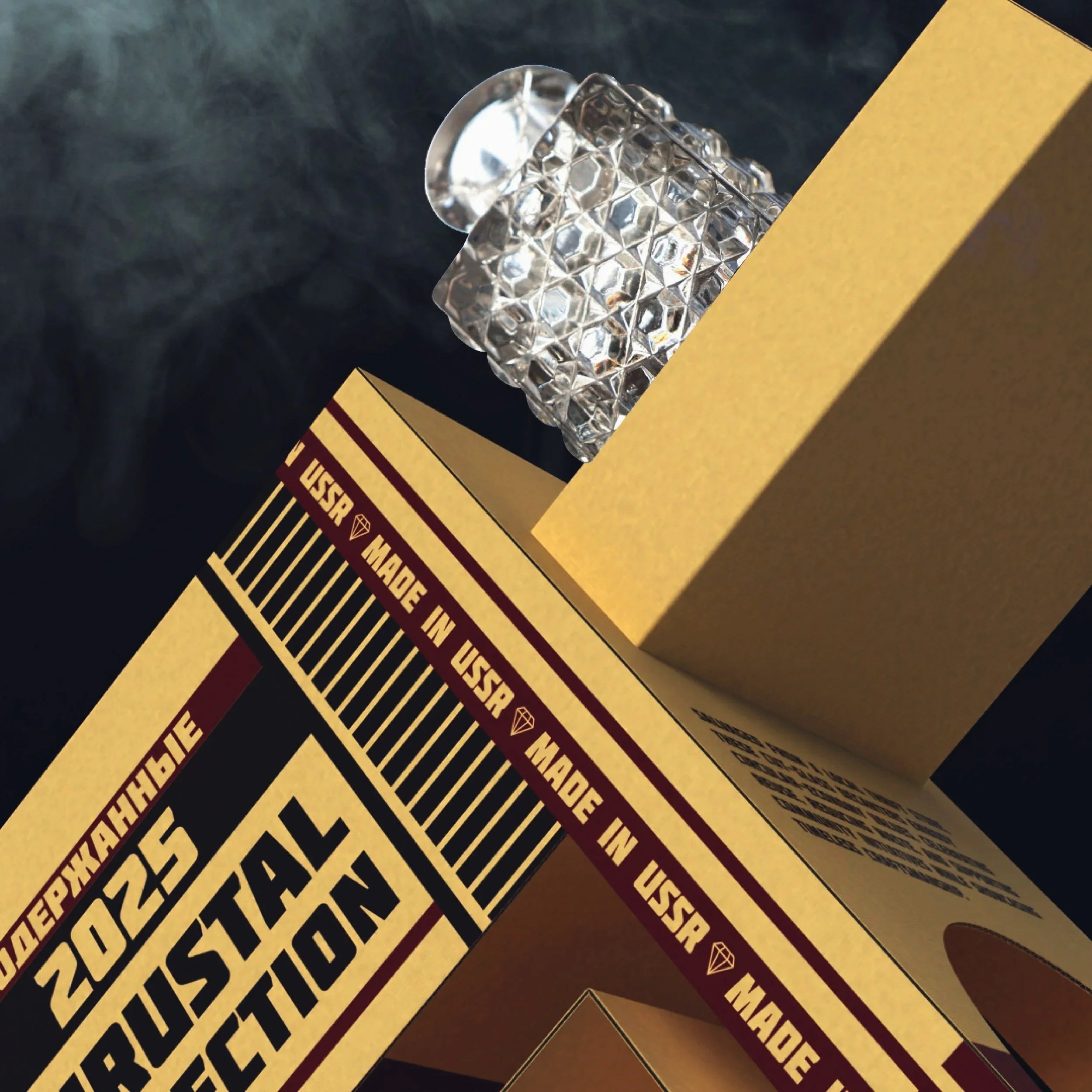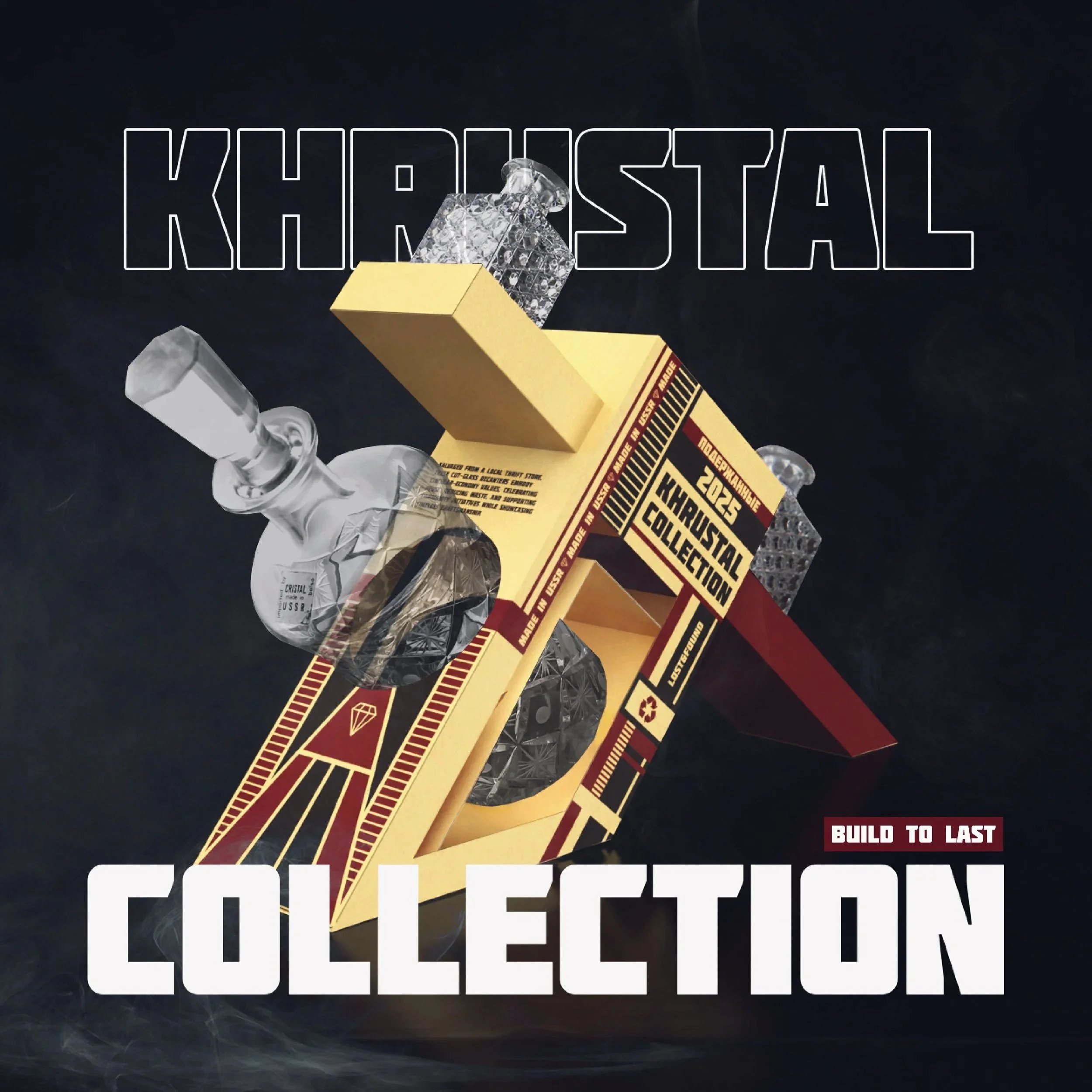 Khrustal Collection is one bold piece built around three authentic Soviet crystal decanters. It mixes the clear, geometric look of constructivism with the strong, raw feel of brutalism: simple shapes, deep cuts in the glass, and a purposeful diagonal layout that make it both beautiful and useful. Every part has a job, materials are shown honestly and the form follows function. So the work feels timeless, not trendy.